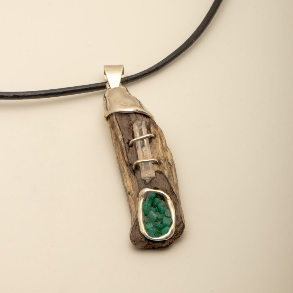 Talismán con madera del pacífico Colombiano, con incrustaciones de plata fundida y murallas de Esmeraldas Colombianas