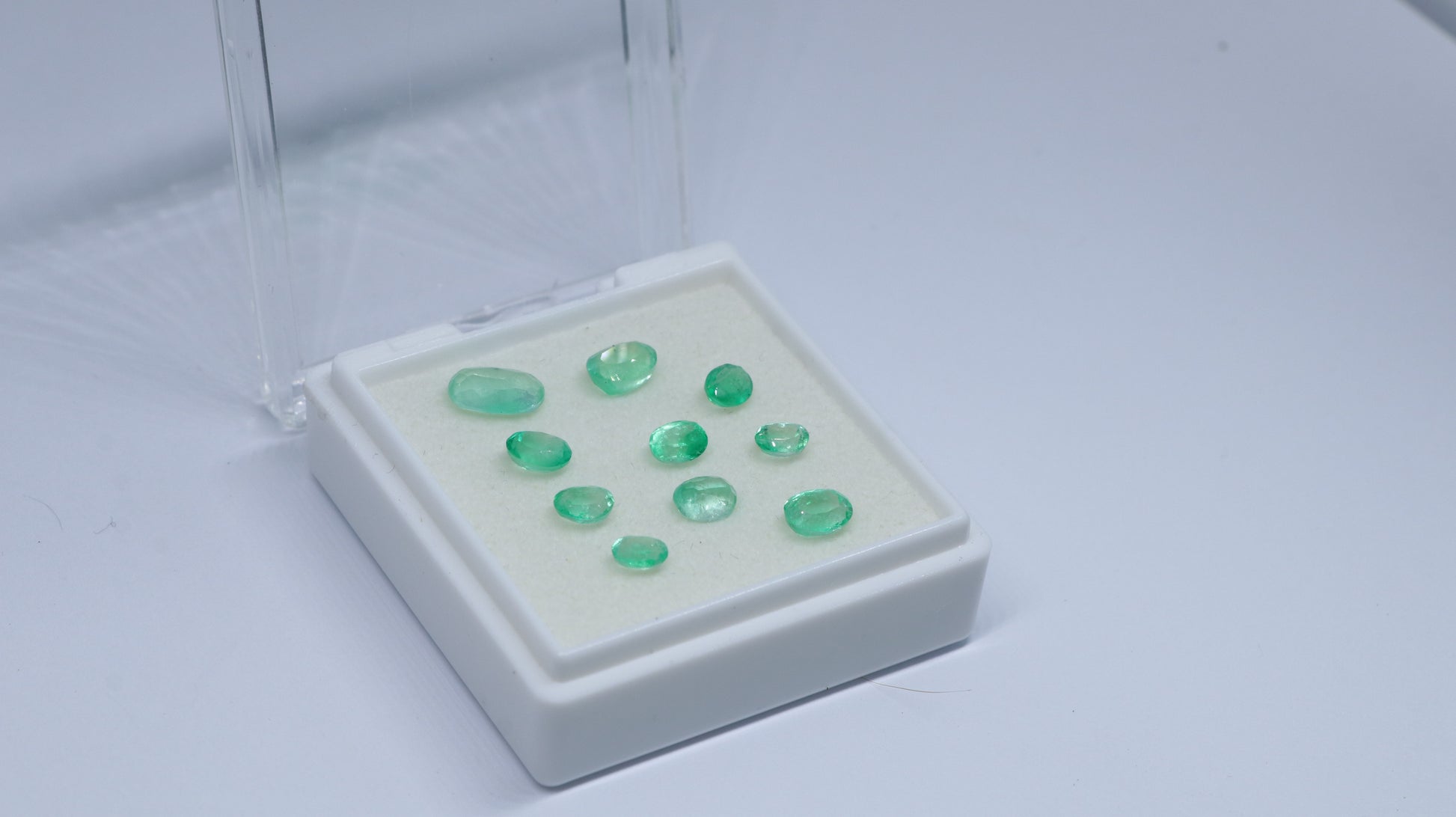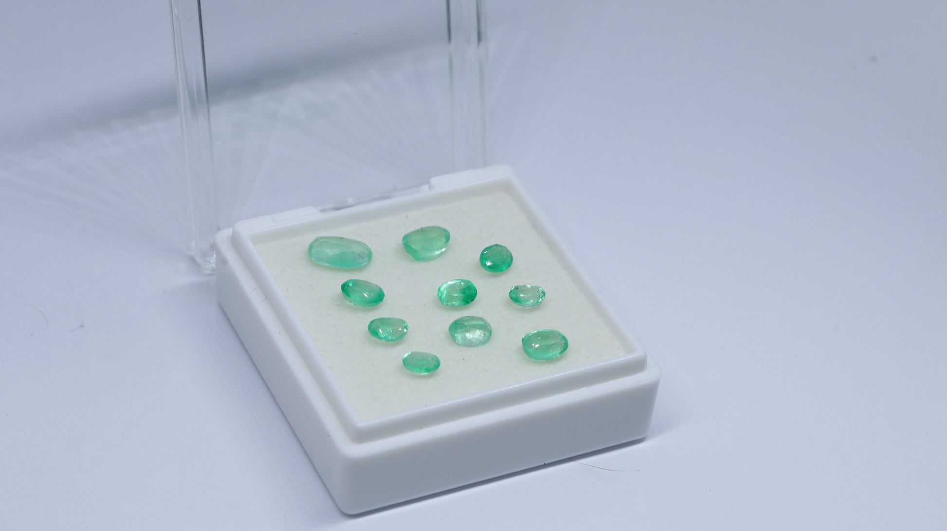 Esmeraldas Colombianas CertificadasCantidad: 10Calidad: Comercial, Cristal con TonoCTs: 4Talla: Óvalos